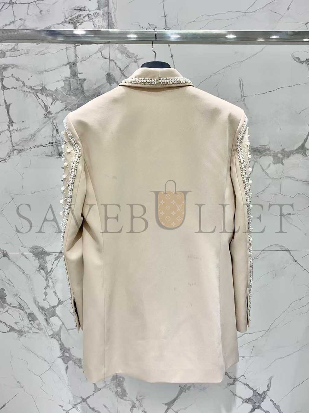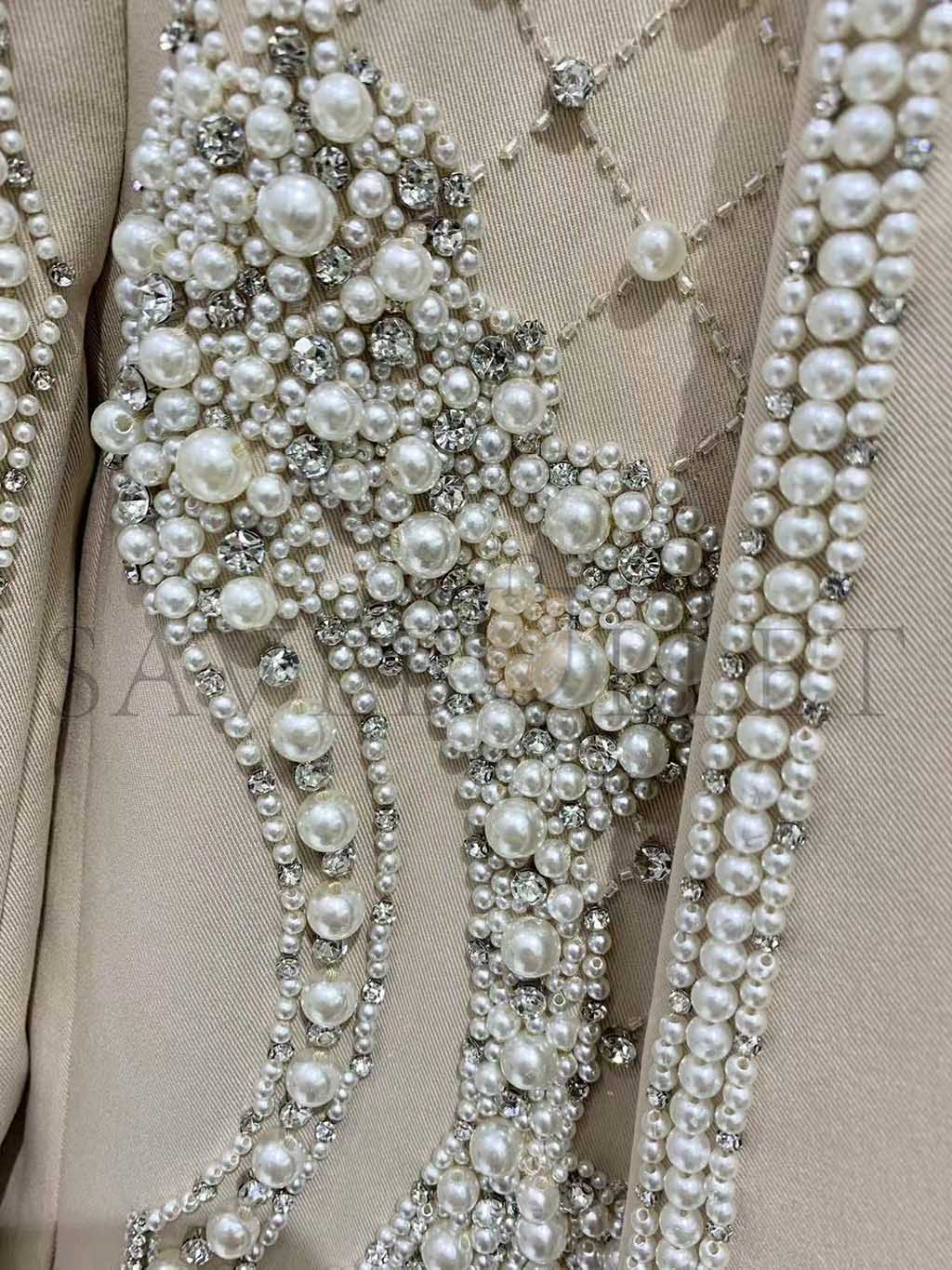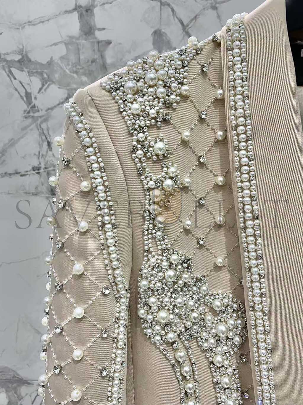 BALMAIN BEIGE CRYSTALS & PEARLS EMBELLISHED SHAWL LAPEL BLAZER