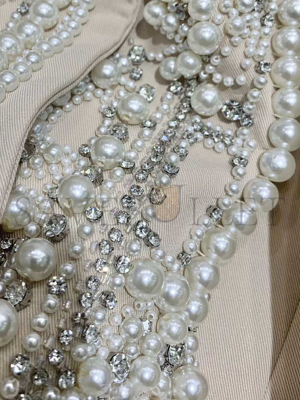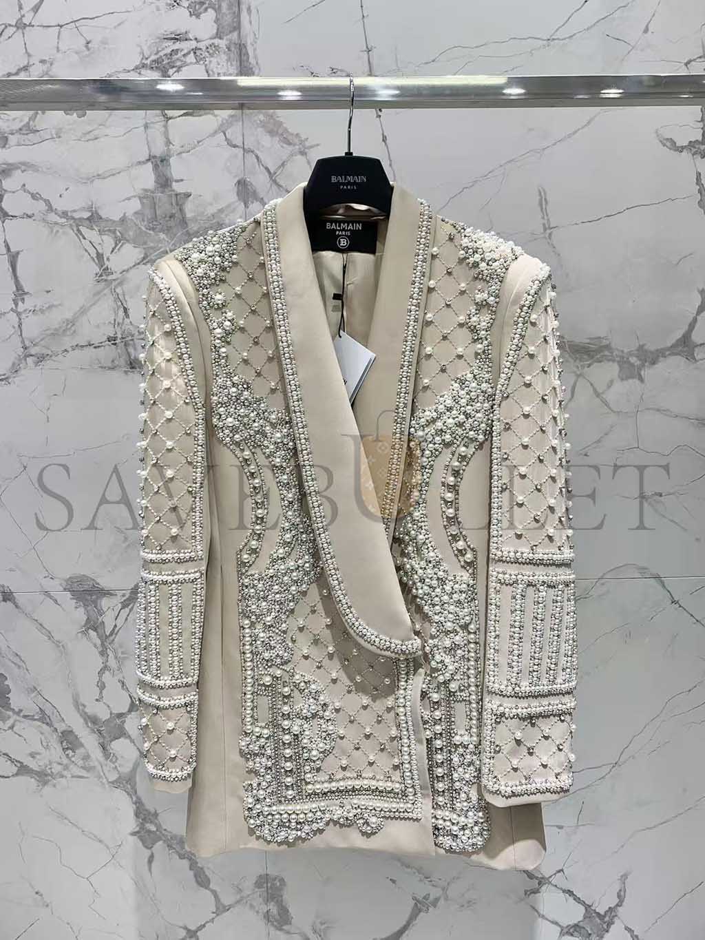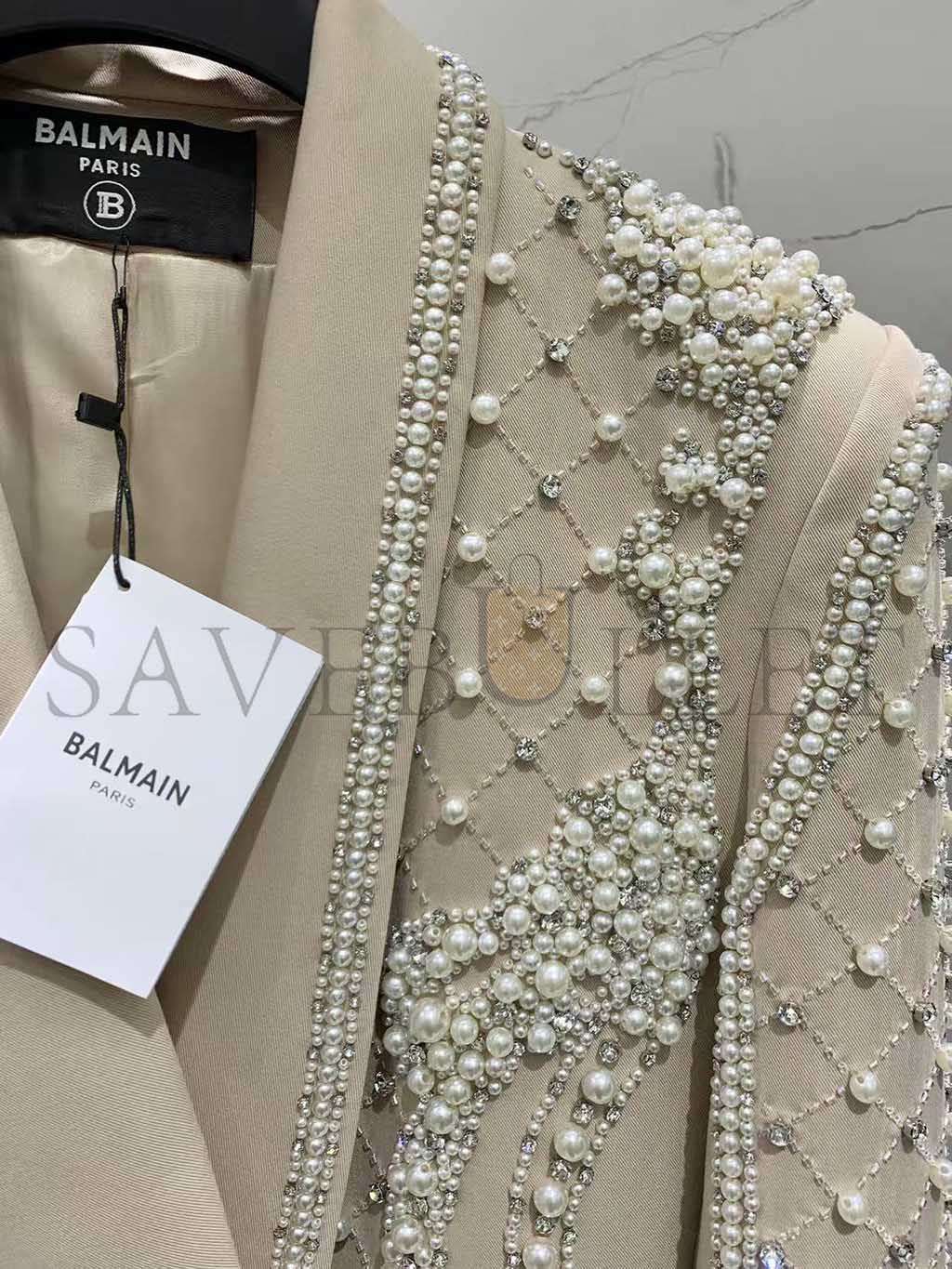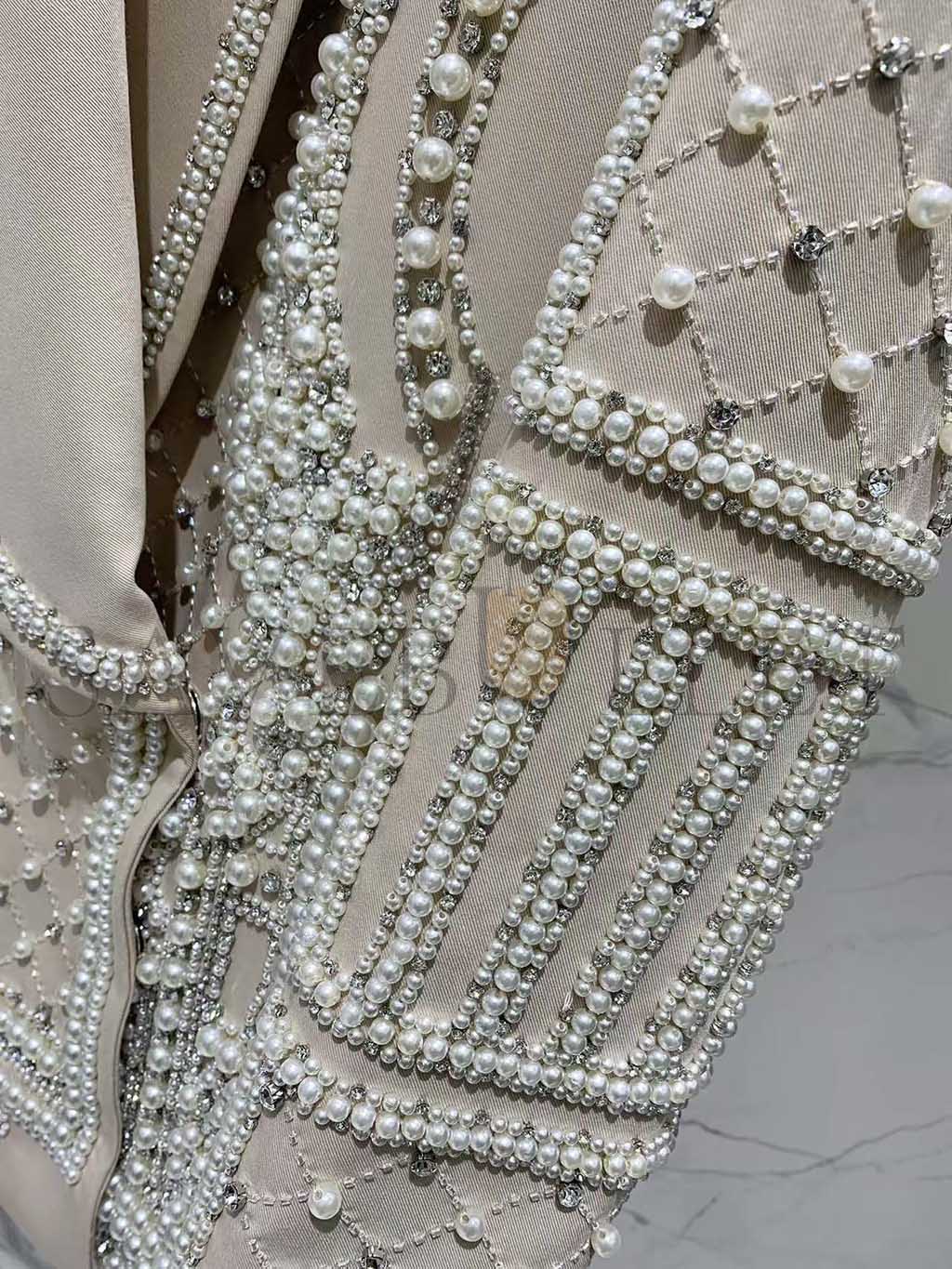 BALMAIN BEIGE CRYSTALS & PEARLS EMBELLISHED SHAWL LAPEL BLAZER